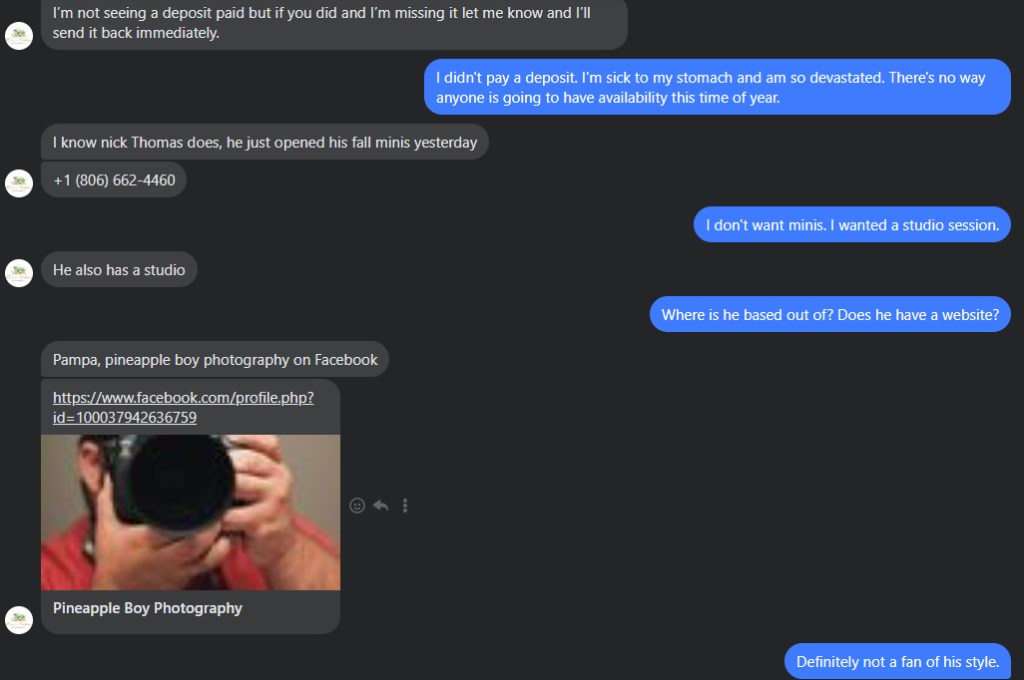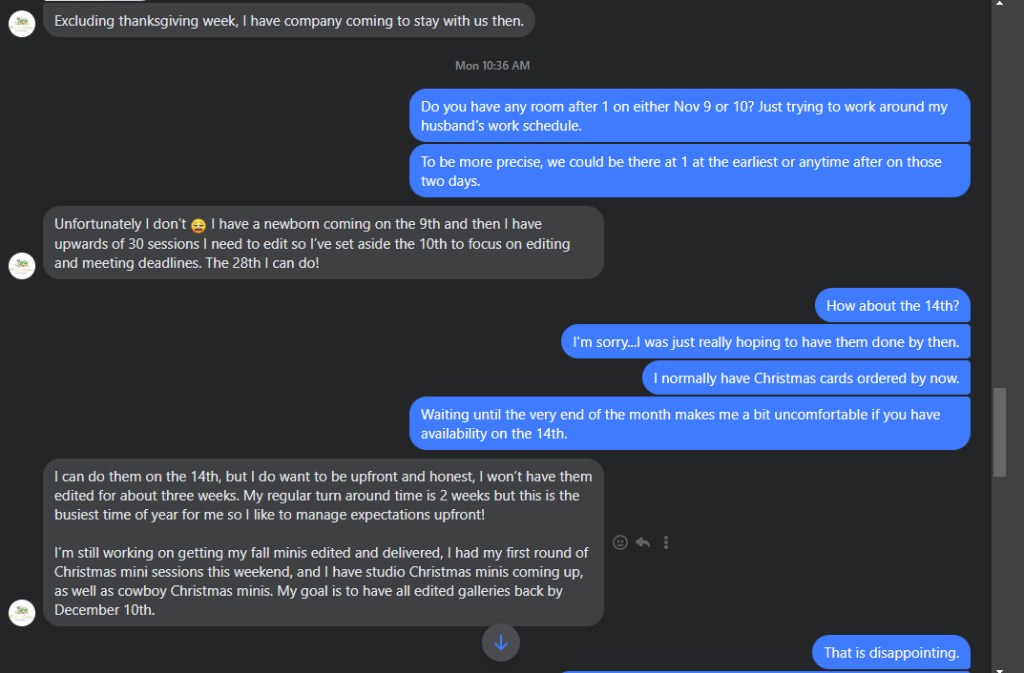 The morning of the 4th, I received a message from Kristin informing me that her son was sick and that she would have to reschedule. I responded to her message immediately — gave condolences and well wishes with regards to her son’s sickness and then asked if we could reschedule for Friday, November 11, 2022. By Monday morning she hadn’t responded (which is understandable), so I messaged her again to see what her availability was. She said that she has a wedding “all day” Friday, November 11, and is unavailable. She sent me a screenshot of her calendar and told me to pick a day that works for us. After seeing her calendar, I figured we’d find something that would work because there was a lot of blank space, so I picked out a couple of days and messaged her. She told me that she couldn’t take our photos on November 9, 2022, because she has a newborn shoot that day and that she couldn’t take our photos on November 10, 2022, because she is editing pictures that day. She then told me that she could schedule us for November 28, 2022. I told her that scheduling for the end of the month made me a bit nervous because I was planning on using the pictures for our Christmas cards. I asked her if we could book for November 14, 2022, (because that day was completely open on her calendar), and she said yes…and then came back and said that she checked her personal calendar and can’t do the 14th because her son has a therapy appointment that day, so I said, fine, we’ll take the 28th. Then she came back and said that she checked her personal calendar (keep in mind that she’s already offered me the 28th at this point), and she can’t do the 28th because they have family in town that day.