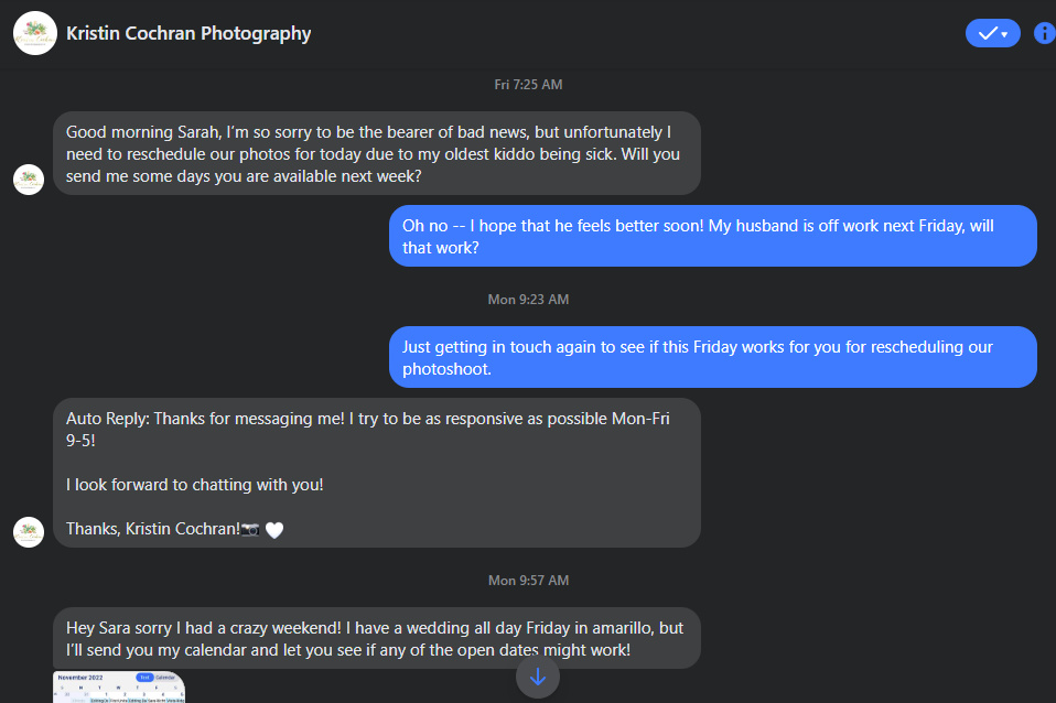 The morning of the 4th, I received a message from Kristin informing me that her son was sick and that she would have to reschedule. I responded to her message immediately — gave condolences and well wishes with regards to her son’s sickness and then asked if we could reschedule for Friday, November 11, 2022. By Monday morning she hadn’t responded (which is understandable), so I messaged her again to see what her availability was. She said that she has a wedding “all day” Friday, November 11, and is unavailable. She sent me a screenshot of her calendar and told me to pick a day that works for us. After seeing her calendar, I figured we’d find something that would work because there was a lot of blank space, so I picked out a couple of days and messaged her. She told me that she couldn’t take our photos on November 9, 2022, because she has a newborn shoot that day and that she couldn’t take our photos on November 10, 2022, because she is editing pictures that day. She then told me that she could schedule us for November 28, 2022. I told her that scheduling for the end of the month made me a bit nervous because I was planning on using the pictures for our Christmas cards. I asked her if we could book for November 14, 2022, (because that day was completely open on her calendar), and she said yes…and then came back and said that she checked her personal calendar and can’t do the 14th because her son has a therapy appointment that day, so I said, fine, we’ll take the 28th. Then she came back and said that she checked her personal calendar (keep in mind that she’s already offered me the 28th at this point), and she can’t do the 28th because they have family in town that day.